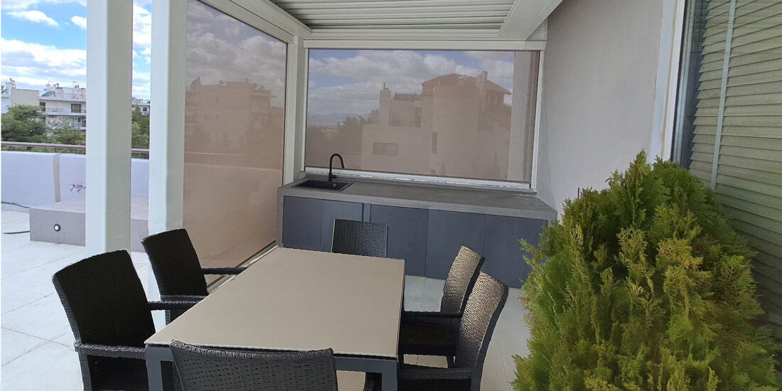 Creation of a barbecue area on the rooftop for year-round use. Selection of the Cospibio pergola system with side coverage using Cospi-Screen, ideal for ensuring privacy in the space.