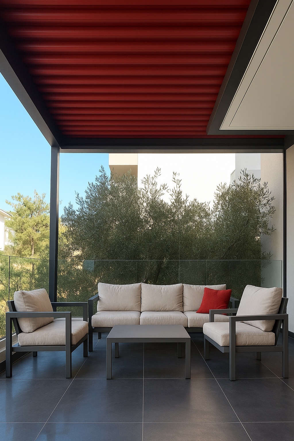 Bioclimatic pergola in custom dimensions and a color selection that harmonizes with and enhances the aesthetics of the space. A newly built residence was completed with the installation of a pergola in the outdoor terrace area.